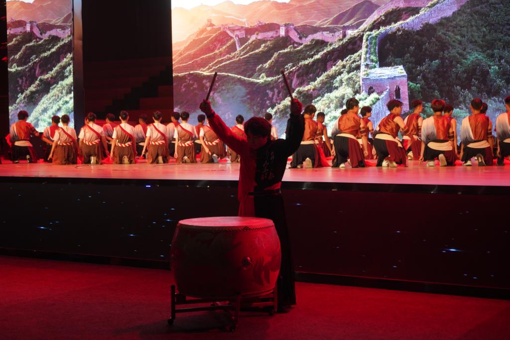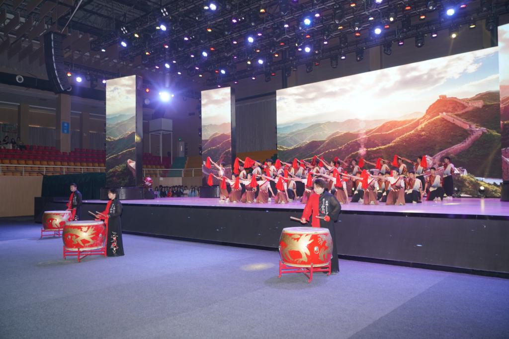 作品中,鼓声时而低沉有力,仿佛从远古传来,承载着民族的记忆,诉说着岁月的沧桑,像是历史的回响;时而又高昂激越,激荡着观众的心灵,感受着中华民族不屈不挠、勇往直前的精神力量。而扇在舞者的手中仿佛被赋予了生命,它时而如春风拂面,温柔细腻;时而如秋叶飘落,凄美哀婉;时而如战士挥剑,刚劲有力,它如诗人的笔触,勾勒出一幅幅美丽的画面,让人陶醉其中,流连忘返。鼓与扇的结合,仿佛天与地的对话,是阳刚与阴柔的和谐。学子们用他们的身体语言,将这两种元素完美地结合在一起,创造出一种独特的艺术效果。他们的舞姿,时而激昂澎湃,如同江河奔腾;时而柔美细腻,如同月光洒落。这种对比与和谐,带给观众强烈的艺术震撼,让人们在欣赏舞蹈的同时,也能感受到中华民族深厚的文化底蕴和不断创新的精神风貌。