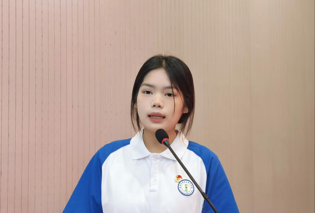 新团员代表肖鹏丽怀着激动的心情,表达了自己加入共青团的荣幸和自豪之情。作为新团员,她提出要坚定信念、积极进取,认真学习党的路线、方针、政策,不断提高自己的政治觉悟和思想素质。作为学生,要勤学善思,立足本职,努力学知识、长本领、增才干。作为新时代的铁道学子,要以“钢小伙、铁姑娘”的精神风貌,勇挑重担,奉献国家,书写属于铁道共青团员的壮丽篇章。
