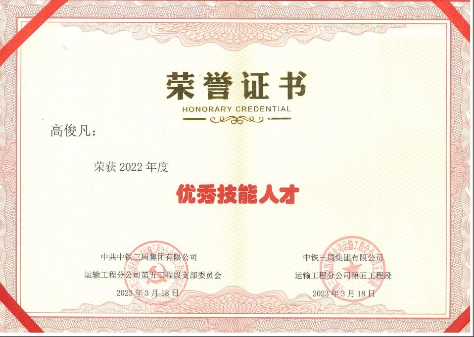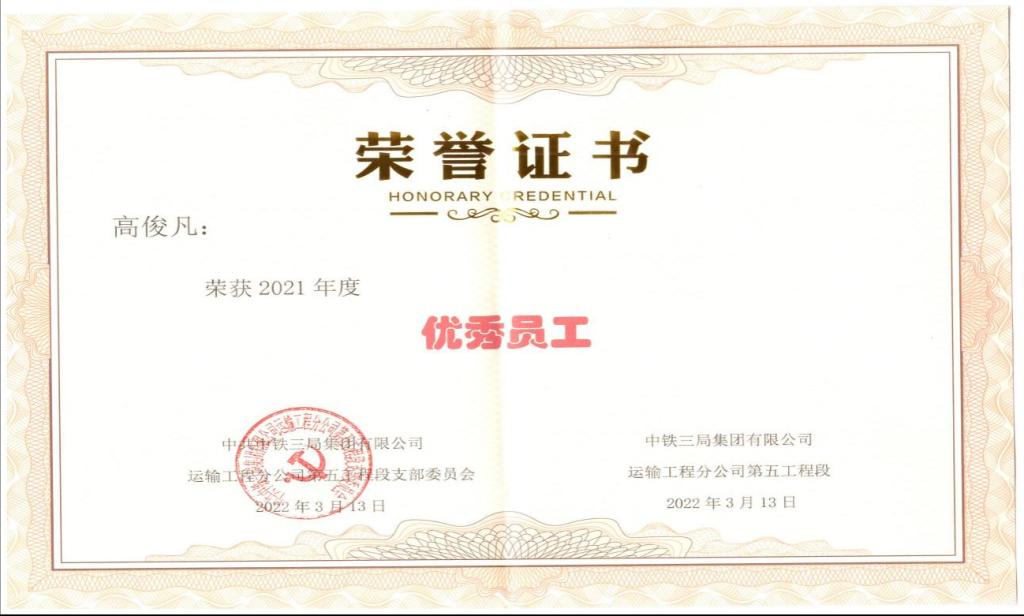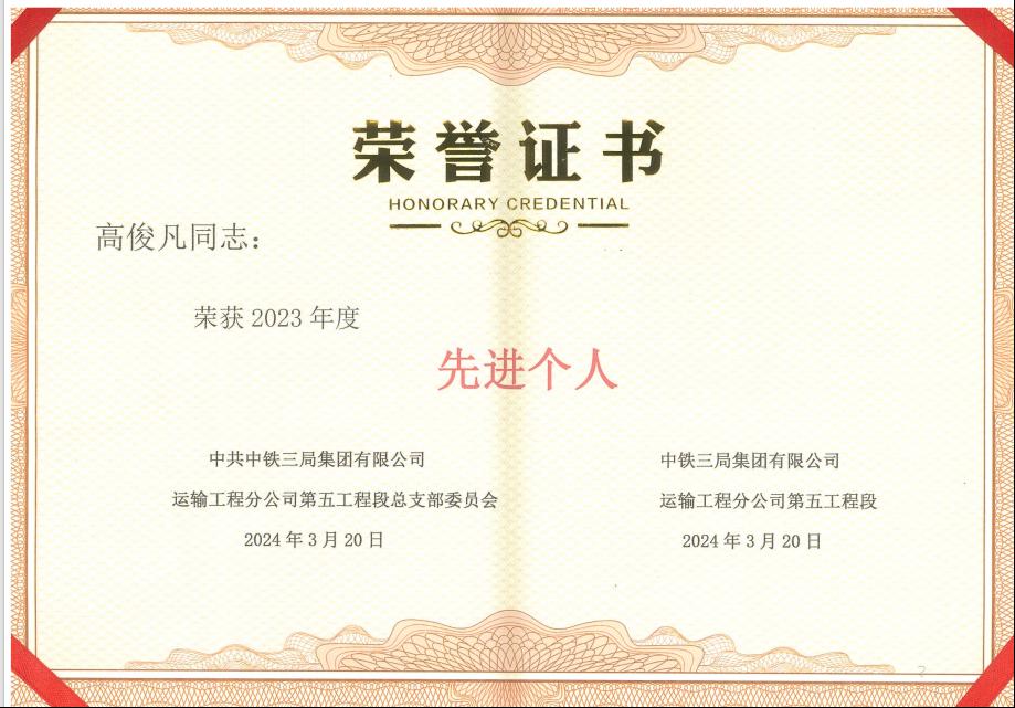 自2021年3月起,高俊凡在中铁三局集团有限公司中德产业园项目经理部运维部负责运营道路维护管理工作。他严格要求自己,认真钻研技术技能,工作积极主动,赢得了同事和领导的一致好评。他的努力与付出得到了应有的回报。在工作期间,他荣获甲方单位沈阳西部建设投资有限公司评选的2021年度运营管理“先进个人”称号、中铁三局集团有限公司运输工程分公司第五工程段2021年度“优秀员工”称号、中铁三局集团有限公司运输工程分公司第五工程段2022年度“优秀技能人才”称号和2023年度“先进个人”等,这些荣誉不仅是对他个人能力的肯定,更是对他辛勤付出的最好回报。