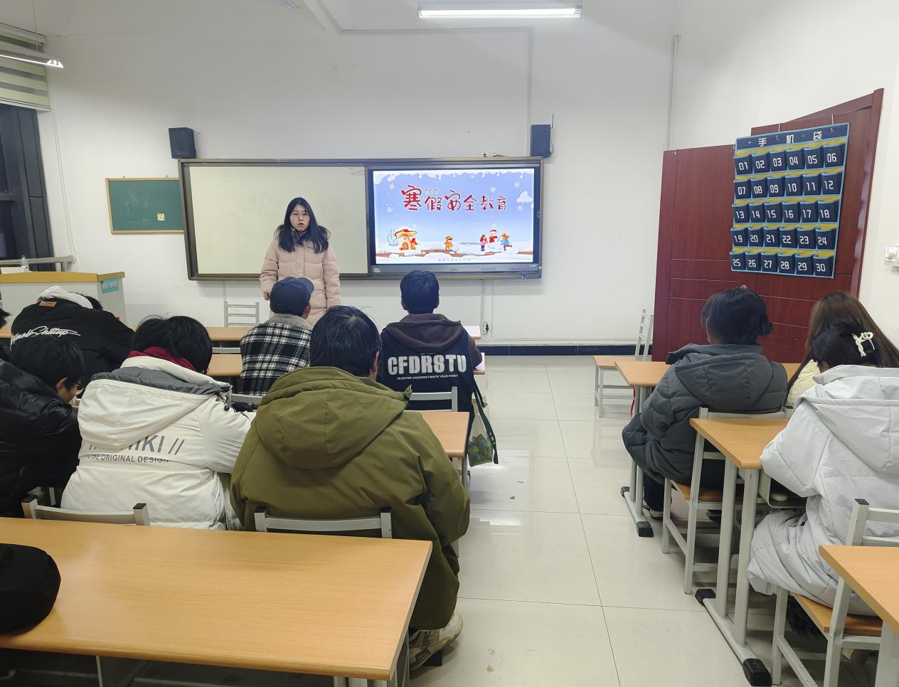 班会上,各班级辅导员/班主任强调所有同学要进行寒假离校登记、签署寒假安全告知书。通过案例等给同学们强调要遵守交通规则,注意出行安全;提醒同学们注意个人信息保护,防范网络诈骗;提醒同学们在家中注意用电、用火安全,防止意外事故;强调冬季冰面安全,避免在冰面上行走或玩耍,防止溺水事故;关注同学们的心理健康,提供心理支持和咨询,帮助他们应对假期中可能遇到的压力和挑战;通过案例视频普及消防安全知识,掌握火灾逃生技能;强调健康饮食,预防疾病,注意个人卫生;提醒同学们在旅游期间注意安全,遵守旅游规定,掌握紧急情况时的应对措施;为计划在假期兼职的同学提供指导,避免陷入非法或不安全的工作环境。